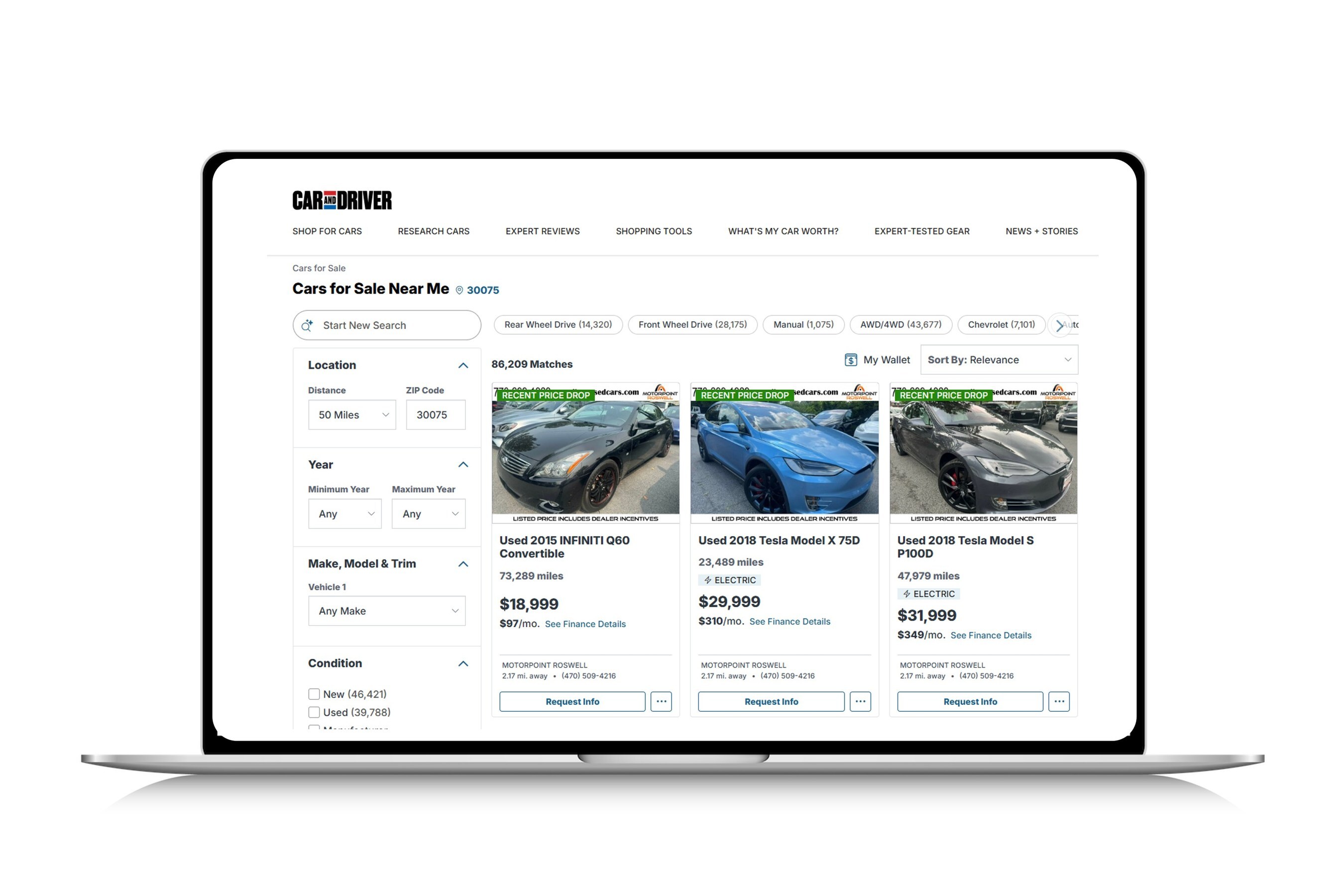 The new Car and Driver Marketplace is a seamless, all-in-one experience on caranddriver.com. Shoppers browse more inventory, use smarter search tools, and connect directly with dealers without leaving the site. It is fast, easy to navigate, and backed by Autotrader's trusted tech and lead tools.